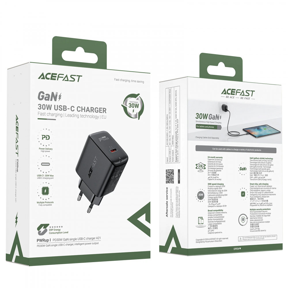 ПРОИЗВОДИТЕЛ Acefast КОД НА ПРОИЗВОДИТЕЛЯ ACEFAST-A21-BK ТИП За стена GaN ЗА: Лаптоп Телефон Таблет МОЩНОСТ 30 W ПОРТОВЕ, БРОЙ 1 ПОРТОВЕ USB-C x 1 ПОРТОВЕ, МОЩНОСТ 5V~3A 9V~3A 12V~2.5A 15V~2A 20V~1.5A НАЧИН НА ЗАРЕЖДАНЕ DCP PD3.0 FCP QC4+ QC2.0 QC3.0 AFC SAM 5V~2A iP2.4A PPS 30W ЦВЯТ Черен РАЗМЕРИ 81.8 x 28 x 43.7 mm ТЕГЛО 63 g ГАРАНЦИЯ 24 месеца БАРКОД EAN-13 6974316281122