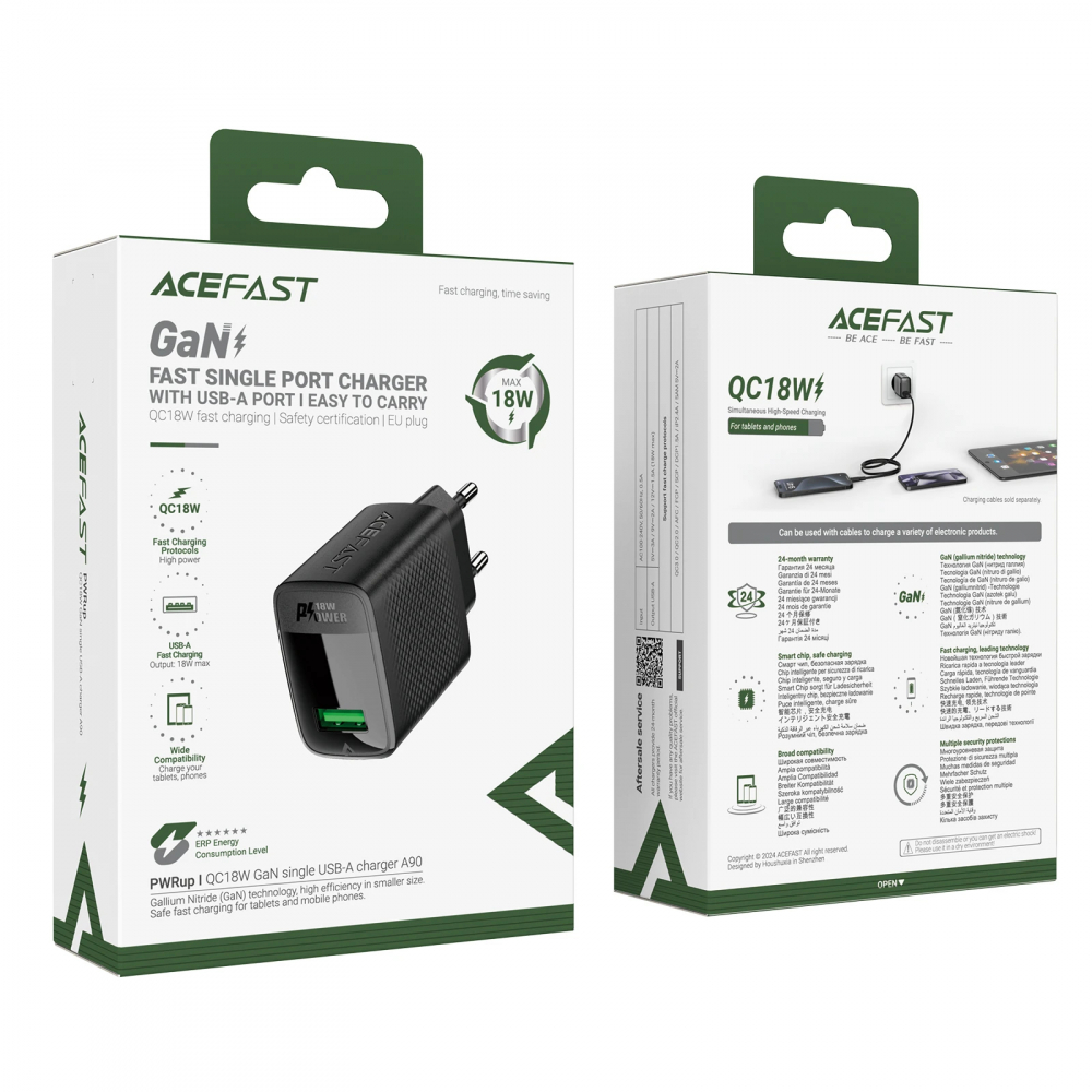 ПРОИЗВОДИТЕЛ Acefast КОД НА ПРОИЗВОДИТЕЛЯ ACEFAST-A90-BK ТИП За стена GaN ЗА: Телефон Таблет МОЩНОСТ 18 W ПОРТОВЕ, БРОЙ 1 ПОРТОВЕ USB-A x 1 ПОРТОВЕ, МОЩНОСТ 5V~3A 9V~2A 12V~1.5A НАЧИН НА ЗАРЕЖДАНЕ QC3.0 QC2.0 AFC SCP DCP1.5A iP2.4A SAM 5V~2A ЦВЯТ Черен РАЗМЕРИ 80 x 40.6 x 26 mm ТЕГЛО 59 g ГАРАНЦИЯ 24 месеца БАРКОД EAN-13 6974316283249