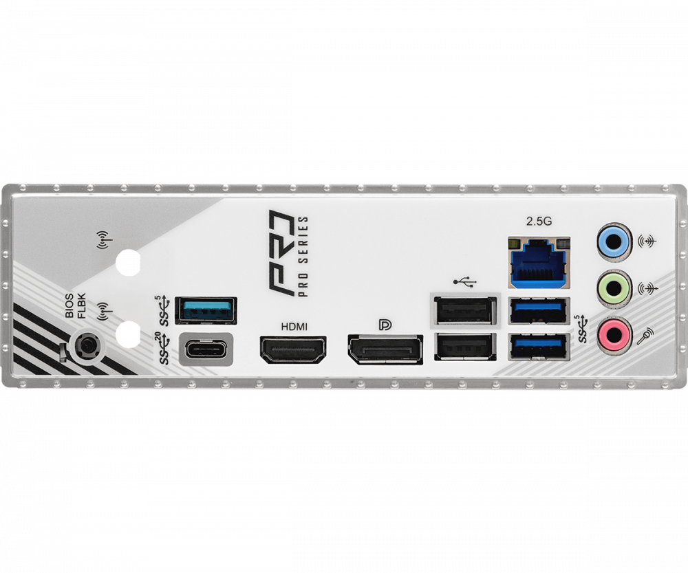 | Портове: | 2 x Antenna Mounting Points;1 x HDMI Port;1 x DisplayPort 1.4;1 x USB 3.2 Gen2x2 Type-C Port (20 Gb/s);3 x USB 3.2 Gen1 Ports;2 x USB 2.0 Ports;1 x RJ-45 LAN Port;1 x BIOS Flashback Button;HD Audio Jacks: Line in / Front Speaker / Microphone |